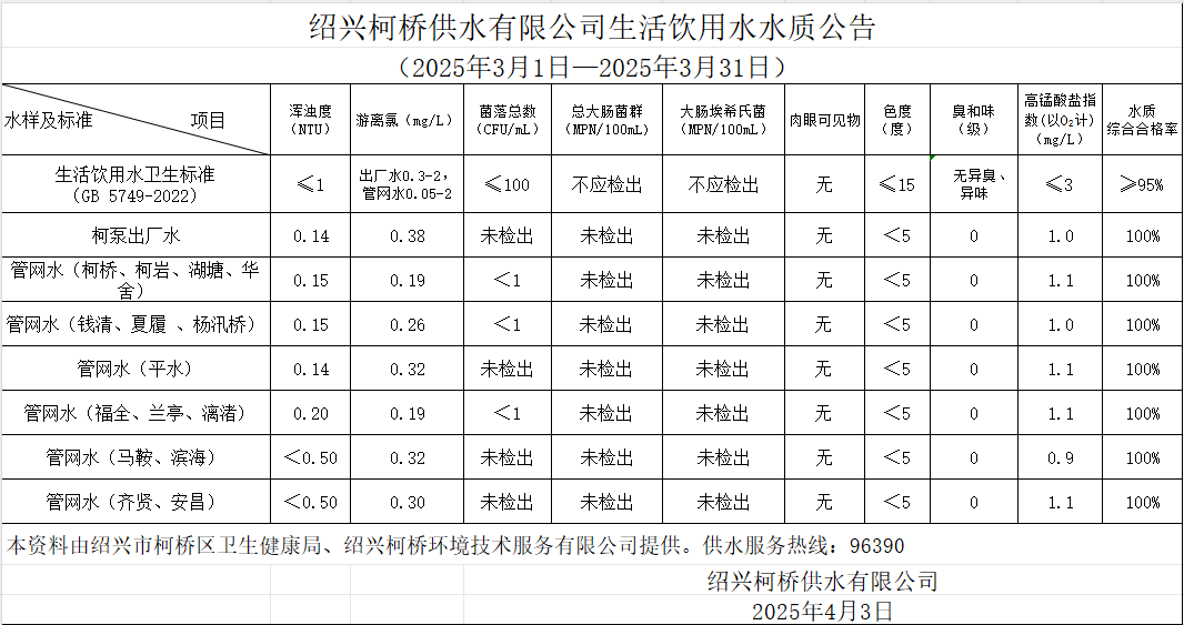 生活飲用水水質(zhì)公告(2025年3月1日—2025年3月31日)