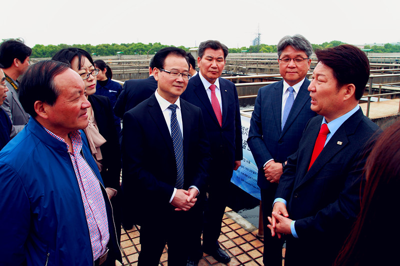4月25日,由韓國(guó)大邱市市長(zhǎng)權(quán)泳臻帶隊(duì)的韓國(guó)大邱市友好經(jīng)貿(mào)訪問(wèn)團(tuán)一行26人,在紹興市副市長(zhǎng)徐明光、副區(qū)長(zhǎng)王志強(qiáng)等陪同下,到紹興水處理公司參觀考察。集團(tuán)公司副總經(jīng)理胡張堯等陪同。