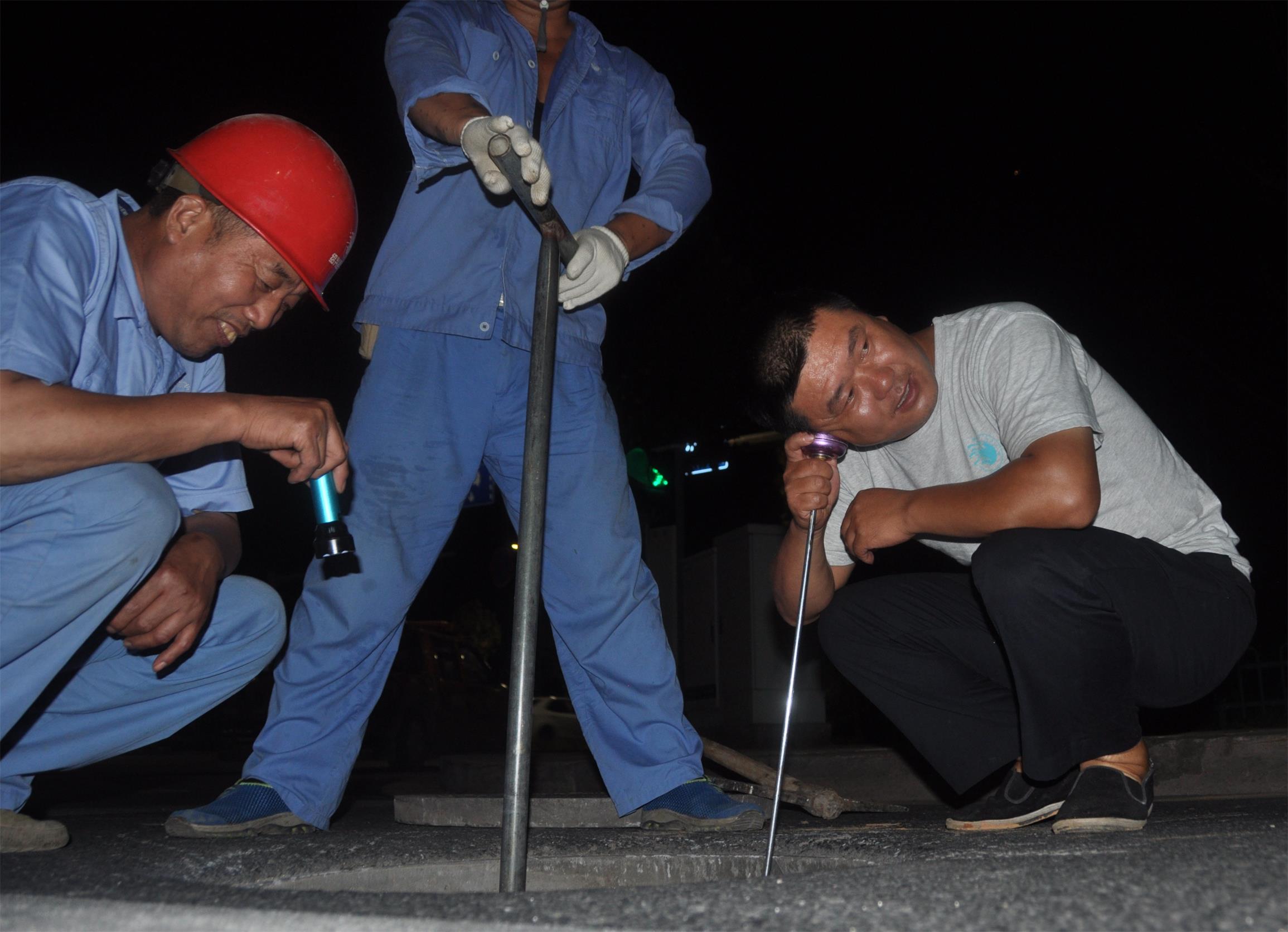 為進(jìn)一步降低水量漏損,8月8日晚,城區(qū)分公司在前期集中“會診”的基礎(chǔ)上,協(xié)同管網(wǎng)分公司精干力量組成一支16人組成的“出診隊伍”,對柯巖南片香林大道、高爾夫路、柯巖大道和南閑路四條總管進(jìn)行了夜間集中聽漏。聽診人員穿梭在夜深人靜的馬路上,用耳、用心感受“地下網(wǎng)”的疑難雜癥,發(fā)現(xiàn)可疑漏點隨即記錄筆記,并在隱患處做上標(biāo)記,沒有言語交流,卻彼此配合默契。次日把“診斷報告”帶回,進(jìn)行集中“會診”后再“對癥下藥”。